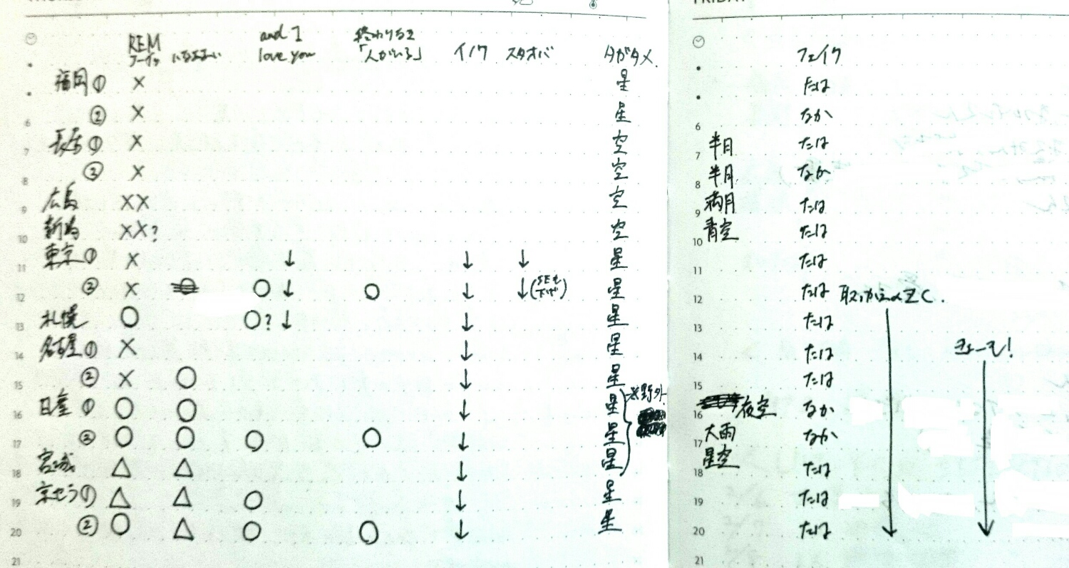 *Encore さーて泣いてる場合じゃない!!ここからが腕の見せどころ(?)でございます!!!!……というのは冗談として、実際自分が毎度毎度かなりの熱を込めて参加していたのが、ここ。 色んな物議を醸しましたね。次の曲の演出を見越して一番はじめにつけた誰かが悪いとも言えはしますが遅かれ早かれ起こることだったんだと思う。 自分もはじめはやきもきしていました。でもそれはライトがつくことよりも、ライトをつけることで拍手が消えてしまうことに対して。何故ならそれでもさくらいさんは変わらず「盛大なアンコールの声と拍手、どうもありがとう!!」と言ってくれるから。なんだか嘘をつかせているような気がして、ただただかなしかった。 それを嘘じゃなくて本当にしたい!!と思いはすれどここはスタジアム。アリーナとはケタ違いのキャパシティに人の数。その「人」というのも本当に色んな人がいる。それを思っては途方に暮れるような思いになることも、あの一体感とあたたかさを何度も感じられたアリーナを思い出して恋しくなることも多々ありました。 それなら不平不満をたらすのか?自分の身近で噂を聞いて「ツアー頭の公演に行っててよかった」、「ライブが楽しみだったけれどだんだん楽しめるか不安になってきた」という声を聞いてそれだけはやらないようにしようと思った。特に既参戦者がまだ参戦していない人の楽しみやわくわくドキドキを妨げたり不安にさせたりするのは絶対にだめだ、なんて思って。 それならあれだ、「暗いと不平を言うよりも、すすんであかりをつけましょう」!そう思ってから自分のこの時間への気持ちの持ちようが変わりました。 この場合自分にとっての「あかりをつける」ことは明かりをつけることではなかったけれど(笑) ここまでこんなふうに語っては来ましたが、 正直ライトを選ぶことは間違いとか悪いこととは言えないと思っていました。この状況の発端となった人を除いては、多くの人は「みんながやってるからやんなきゃいけないのかな」、とか「やった方がいいのかな」、「サプライズかな」、「メンバーが喜んでくれるかな」、とかいろんな想像を巡らせてそれを選んでいたんだと思います。その人たちがこの演出の意味や何が起こっているかを知らないが故にやったことを正誤や善悪という価値観に単純に当てはめるべきじゃないんじゃないか、と思う。その人たちがしらないことがあるのと同じように初めて参戦する人たちやライトを先につける状況が定着してしまった後に参加してきた人たちがどう思ってそれをやったのかを私たちは想像することしかできないしその想像が完璧なはずだと思わない方がいいと思う。 そう考えた上で、この状況下で拍手を選ぶかライトを選ぶかはある種自由だと思いました。それは曲を聴いて縦振りするか横振りするか拍手するか何もしないかっていう選択が自由なのと同じように。 みんなが縦振りしてる中で拍手しちゃだめなのか、っていったらそうやって統一されたり正されたりするようなものだとは思わないし、同じように拍手をする「べき」しなきゃ「ならない」とは思わない。ただ、自分が拍手をして迎えたい、拍手でメンバーにアンコールを伝えたい、「拍手をありがとう!」という言葉を本当にしたい、応えたいと思うから拍手をするし願わくばみんなにももし拍手をするなら拍手する「べき」やライトつける「べき」と思ってじゃなく「拍手したい!」と思って拍手してもらえたらいいな、と思ってある公演から立って頭の上で拍手するようになりました。 なんで拍手しないの?じゃなくて拍手楽しいよー!、まずは自分が楽しんでやる!楽しもう!、と。 実際そうやってやるようになってからは本当に楽しかった!終盤の公演ではさくらいさんが「拍手と声と、そしてこの綺麗な明かり!本当にどうもありがとう!!」って言うようになってたもんだから当初の自分が考えてたことなんて忘れて「よっしゃこっちは拍手担当するからみんなライト担当任せたわ!!!!!!!!(麺担当汁担当)」って気分にすらなってたけどいいだろうMr.myself!!!!!!!!!!!!!!!!!!!!(もはや拍手したいだけの人の様相)(いやいやそんなことは) ……ここまで書いてきた思っていたことの半分くらいは某鳩さんの言葉を消化して得たものです(笑)彼女が言葉にしてくれたおかげで自分の中の気持ちがこうして形になったし、またこの時間の間一緒に手を叩いてくれた隣のあなたや見知らぬあなたがいてくれたおかげで自分にとってのこの時間が楽しくてハッピーなものになったんだと心から思っています。 本当に、どうもありがとう。En.1 I wanna be there いつの間にやらセンターステージには彼らが。照明が落とされた暗い中で「見えるー?僕らの方もちょっとつけるね(笑)」なんて言って、センターステージ上の電灯のスイッチをぽちっと。(終盤の公演では足元から照らす照明も増えていたね。) これ、福岡2日目にセンターステージ横の席で見た時5人分用意