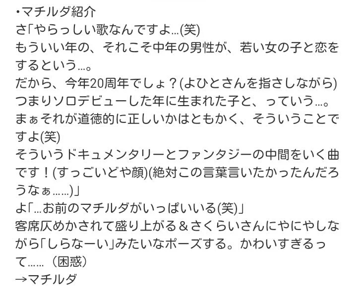 MCでさくらいさんが「同じコ(ード進行の曲が〜)」って言った時点で一緒に見てた人が「え擬態……?」って信じられないって感じでぽつりと呟いてたのが印象的だった、し私も擬態をソロで聴ける日が来るなんて夢にも思ってなかった……。むしろMr.Childrenみんなでやってるのを聴きたいから、ソロで聴きたい曲としては絶対に挙げないような曲だった。だからこそ後ろにバックバンドがついているのにあえてギター一本のみの弾き語りでやってくれたことがすごく嬉しかった。やっぱり擬態は「Mr.Childrenとして演奏したい曲」なんだなぁって思って。
