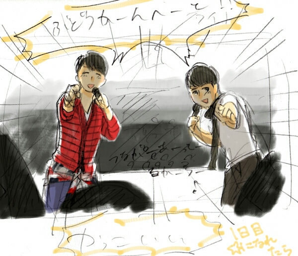 声量の関係でほとんどさくらいさんの声しか聞こえない感じでした…おださんが途中から歌うことを放棄してSB席を回りだしたためおださんの担当部分もアドリブで分担して歌っていた場面もあったと思います。誰も歌わなくてさくらいさん&よひとさんのどちらかが途中から歌う場面もあったので…多分…(笑)